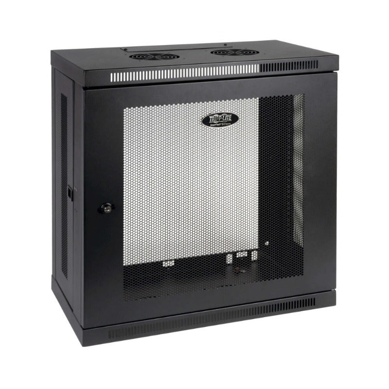 Wall-mount cabinet secures and organizes 12U of 19-inch rack equipment in network closets, classrooms and other locations with limited floor space. Houses patch panels and shallow network switches up to 12.75 inches deep.